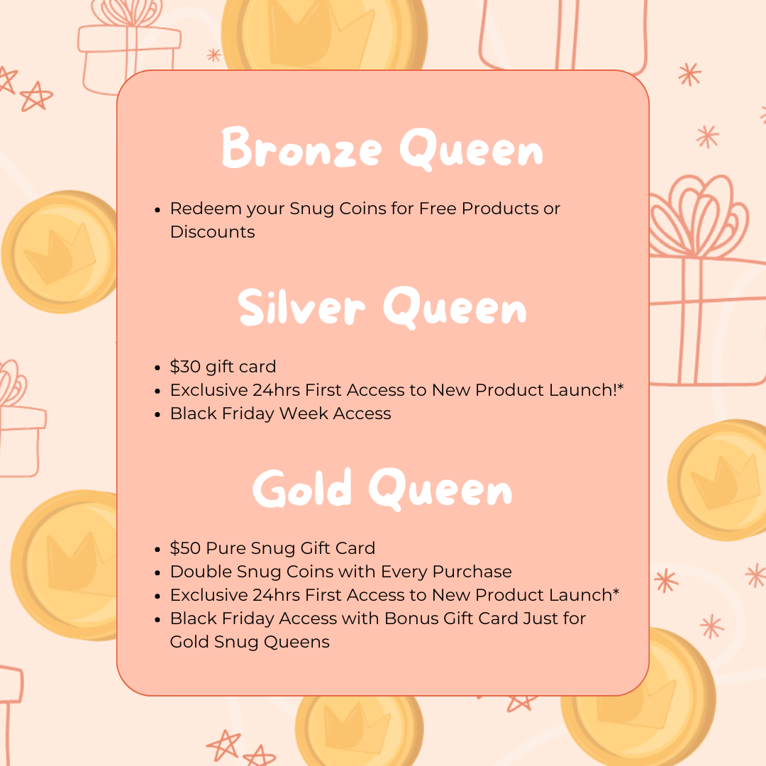 - Gold Queens earn 2x the Snug Coins with every purchase!